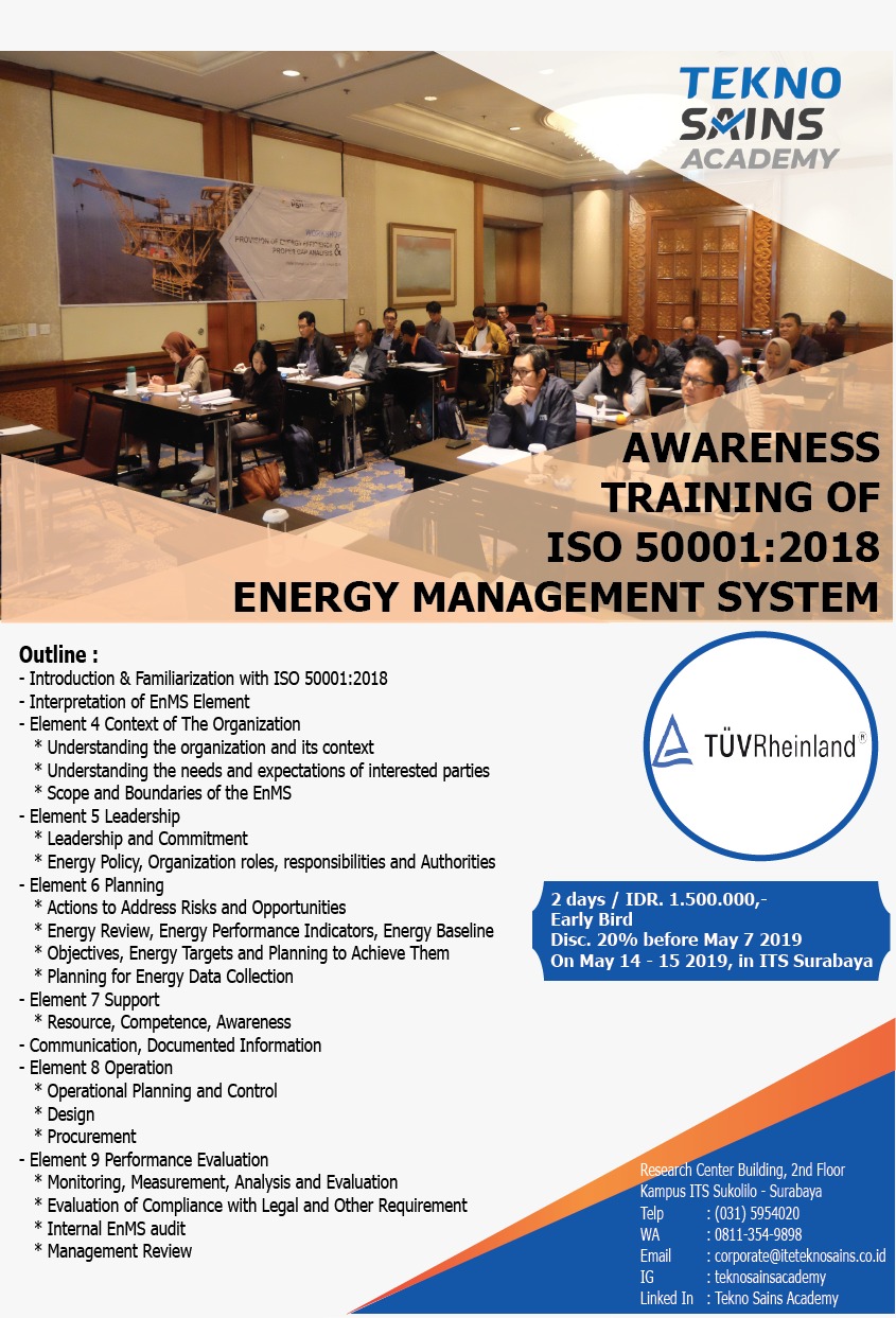 PT ITS Tekno Sains melalui salah satu lini bisnisnya, Tekno Sains Academy menyelenggarakan pelatihan yang bertajuk “Awareness Training of ISO 50001:2018 Energy Management System”. Pelatihan ini rencananya akan dilaksanakan pada 14-15 Mei, dan bertempat di kampus ITS Surabaya. Dalam pelatihan ini, Tekno Sains Academy bekerja sama dengan TUV Rheinland Indonesa, sebuah cabang dari perusahaan multinasional…